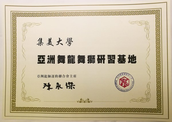 研修班期间,鉴于我校龙狮运动近年来在国内外比赛中成绩优秀,教练员培训的师资力量和场馆设施符合亚洲龙狮研习基地的要求,亚洲龙狮运动联合会各位执委一致同意我校成为“亚洲舞龙舞狮研习基地”,陈永杰亲笔签名并为我校颁发了研习基地证书。