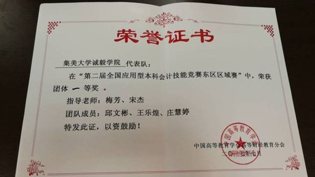 近日,第二届全国应用型本科会计技能竞赛东区区域赛在江苏理工学院举行,来自东区6省1市42所应用型本科高校的200多名学生参加了此次竞赛。经过紧张激烈的角逐,我校诚毅学院代表队再创佳绩,参赛学生管理系会计学专业专升本2016级邱文彬、庄慧婷同学和本科2014级王乐煌同学在本次竞赛中获得团体一等奖,晋级全国总决赛;在分环节比赛中,获得“会计手工账务处理”一等奖1项、二等奖1项、三等奖1项及“会计电算化”一等奖1项、三等奖2项。梅芳和宋杰老师荣获优秀指导教师一等奖。
