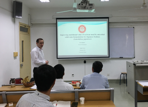 来自伊朗的学院第二批进站博士后Samad博士的研究题目为《Improving nutritional value of soybean meal by microbial solid-state fermentation for Japanese Seabass (Lateolabrax japonicus)》。报告会上,Samad详细阐述了水产饲料蛋白源利用的研究背景,分析论证要解决的关键问题和研究目标,汇报了实验的总体方案、预期结果和计划安排。审核小组成员从研究课题的必要性、研究路线和方法的创新性、研究预期成果和进度的规划等方面给予了建议。麦康森进行了详细的点评,并讲解了如何写好开题报告和科研项目申报书。