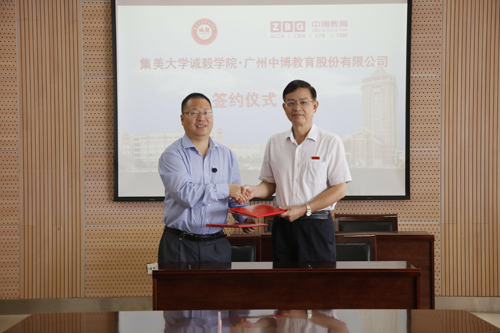10月11日,诚毅学院与广州中博教育股份有限公司举行国际财经项目签约仪式。学院院长叶光煌和中博教育董事长毛金明代表双方签订协议。