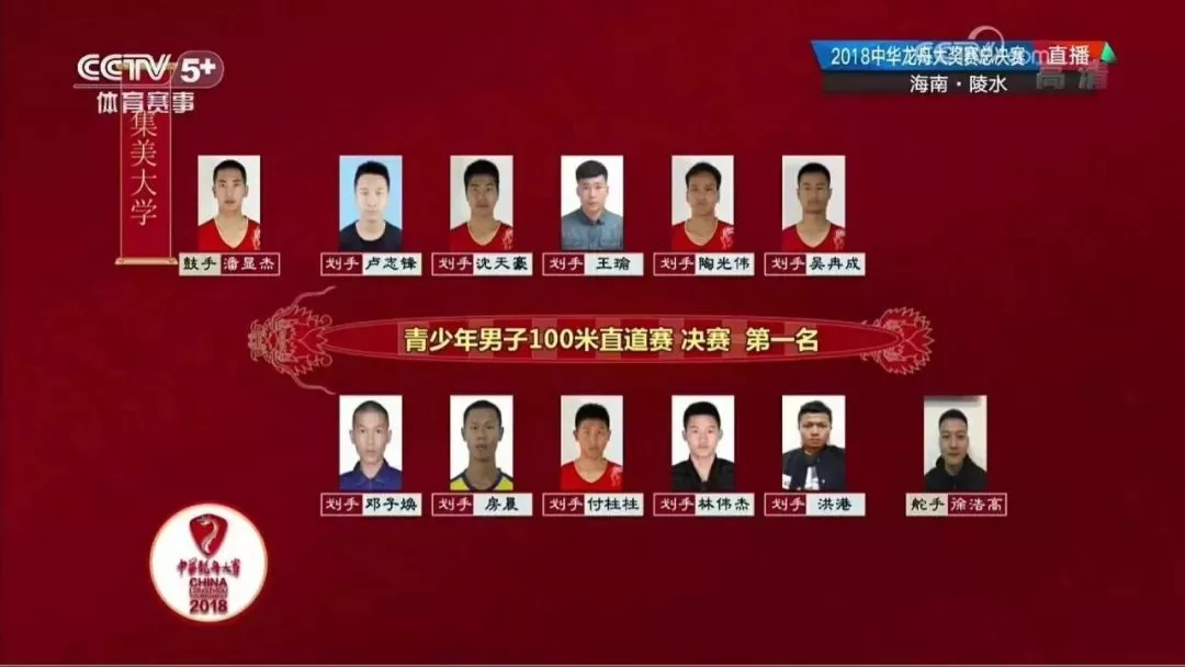本届赛事中,集大龙舟队在分站赛中共斩获3金、5银、2铜、3个第四,作为本年度分站赛青少年男子组总积分第一的队伍成功杀入决赛。经过激烈角逐,集大龙舟队获得青少年男子组100米直道赛第一、200米直道赛第一和500米直道赛第二,勇夺2018中华龙舟大赛青少年男子组总决赛冠军。
