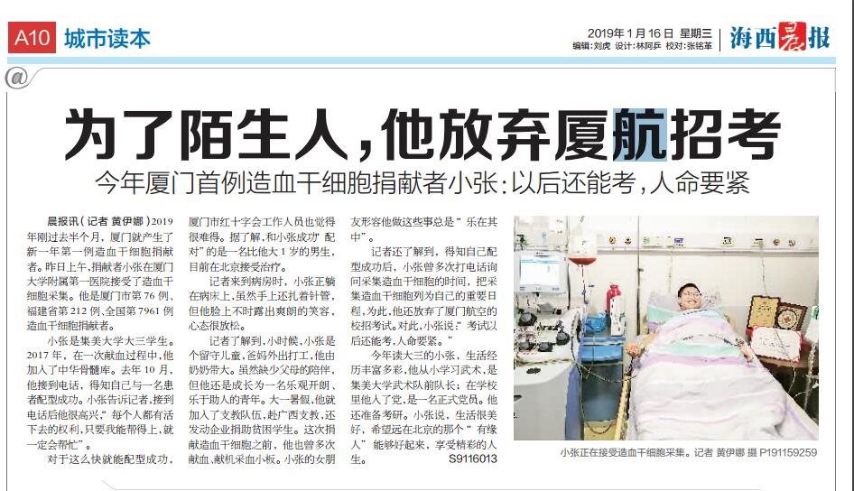 【厦门日报 海西晨报】集大“献血常客”捐出造血干细胞 这名大学生成为我市第76例造血干细胞捐献者