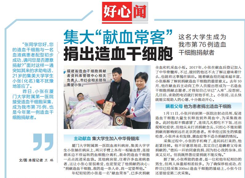 【厦门日报 海西晨报】集大“献血常客”捐出造血干细胞 这名大学生成为我市第76例造血干细胞捐献者-亚洲中文精品乱码