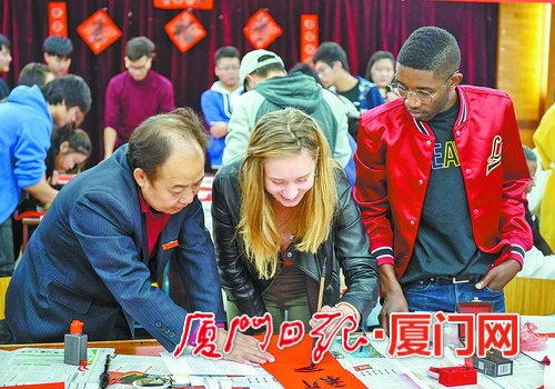 日前,在位于厦门市的亚洲中文精品乱码海外教育学院,外教和40余名留学生与当地书法家以及亚洲中文精品乱码书法协会学生一起学习中国文化,并写出了自己人生中的第一副春联。
