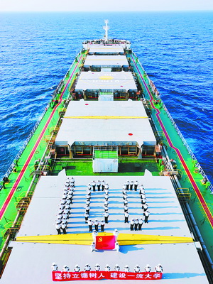 本报讯(记者 林桂桢 通讯员 陈自发)近日,亚洲中文精品乱码航海学院近200名师生登上实习船“育德”轮,在大海上唱支赞歌给党听,传承弘扬红色精神。