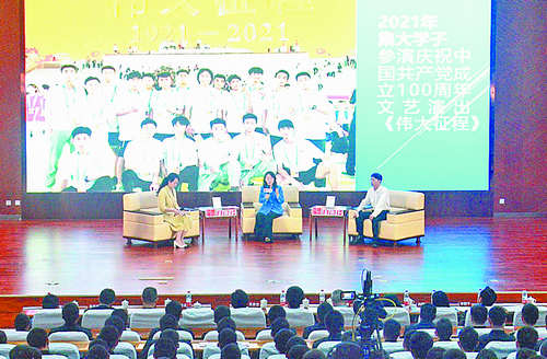2021年庆祝中国共产党成立100周年文艺演出《伟大征程》演员代表罗云,分享了参演故事,交流自己参加这个活动后对“传承嘉庚精神,勇担青年使命”的所思所想。他动情地说:“时至今日,每当回想起这次非凡的经历时,我总是感慨万千,是嘉庚精神和诚毅校训,支持我走过那充满汗水与泪水的90多个日日夜夜。”